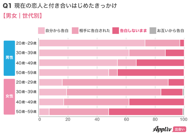 男女別で年代ごとにわけると、男性の方が「自分から告白する」傾向にあり、女性の方が「相手に告白する割合が多いことが分かります。また、年代があがるにつれ「告白しない」人が増えていて、20代男女では告白なしで付き合う人が約1割程度だったのに対し、50代男女では約半数が告白なしで付き合いはじめたようです。