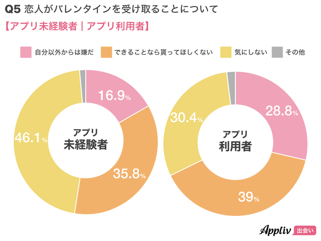また、マッチングアプリ未経験者では半数近くが「(恋人が自分以外から貰うことを)気にしない」だったのに対し、マッチングアプリ利用者の約7割が「自分以外からは嫌だ・できることなら貰ってほしくない」という結果に。