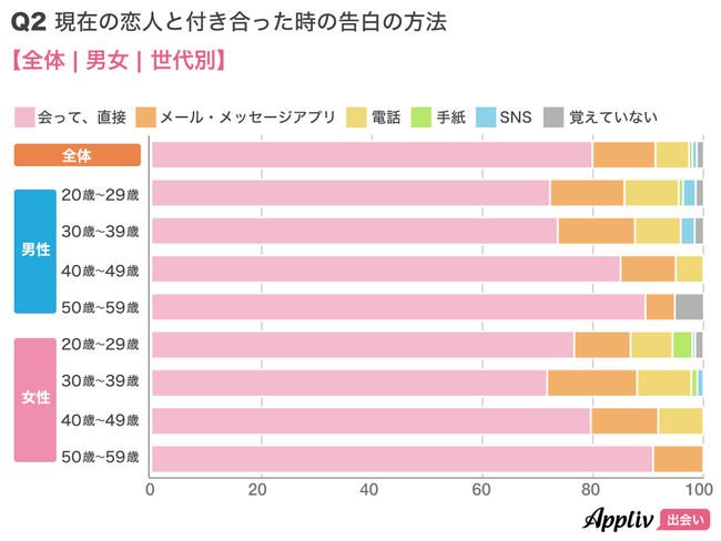 男女別・年代ごとに分けてみても、会って直接告白する人が約7割以上を占める結果に。好きな人には会って直接気持ちを伝えようと考える人が多いようです。また、「メールやメッセージアプリ」「SNS」と回答したのは20代・30代のみでした。