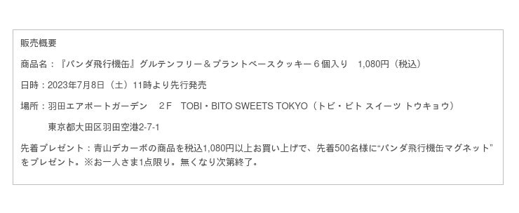 TOBI・BITO SWEETS TOKYOでは、⻘山デカーボの商品を税込1,080円以上お買い上げで、先着500名様に“パンダ飛行機⽸マグネット”をプレゼントします。(※お一人さま1点限り)さらに、「パンダ飛行機」をテーマとして作られた、本商品の世界観を表現する特別なディスプレイもTOBI・BITO SWEETS TOKYO限定で登場します。