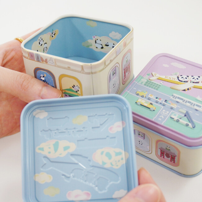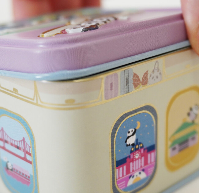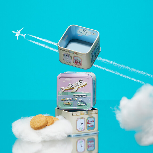 今回初めての試みとして⽸の中にもパンダのデザインを施しました。蓋で隠れる部分に描かれた、機内の収納棚にはパンダの大好きなタケノコや笹、パンダの旅行バッグが入っています。