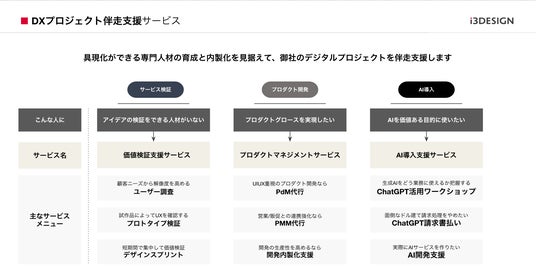 株式会社アイスリーデザインは、ビジネス、デザイン、テクノロジーの力を駆使して、顧客のミッションをあらゆる角度から、DXや内製化を支援するデジタルイノベーションパートナー事業を展開しています。当サービスにおいては、プロジェクトの成功確率を高める手段として、3つのサービスと9つのメニューを用意しています。