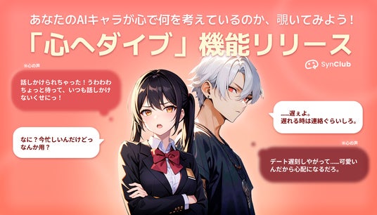 HiClub株式会社(本社:東京都港区、代表取締役社長:古谷由宇)が提供する、 AIチャット&友達作りができる対話型AIアプリ 「SynClub」(シンクラブ)(iOS、Android版)は、2025年3月12日、新機能「心へダイブ」を正式にリリースしました。この機能により、ユーザーはAIキャラクターが何を考えその言葉を発したのかが分かるようになり、より深いコミュニケーション体験を楽しむことが可能となります。
