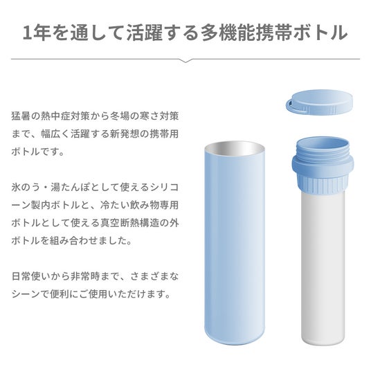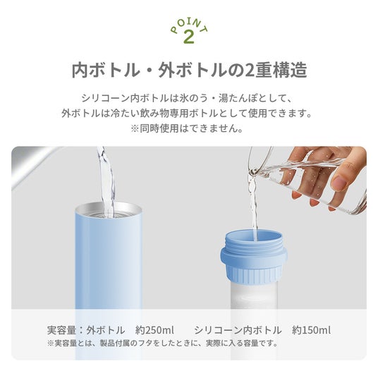 たんぽとして使えるシリコーン製内ボトルと、冷たい飲み物専用ボトルとして使える真空断熱構造の