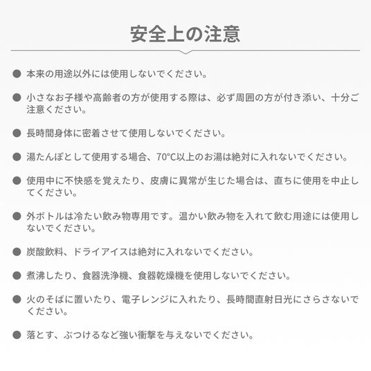 氷のう・湯たんぽ・冷たい飲み物専用水筒として使えます。