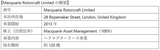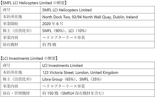 三井住友ファイナンス&リース株式会社(代表取締役社長:橘 正喜、以下「SMFL」)およびLCI Investments Limited(CEO:Jaspal Jandu、以下「LCI」)は、共同出資するヘリコプターリース会社SMFL LCI Helicopters Limited(以下「SMFLH」)が、オーストラリアの金融サービス大手Macquarie(マッコーリー)グループの資産運用会社であるMacquarie Asset Management 傘下のヘリコプターリース会社 Macquarie Rotorcraft Limited(以下「MRL」)を取得する契約を締結したことをお知らせします。