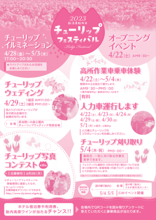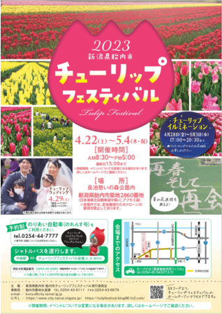 会場には、胎内市内の飲食・菓子店が出店する飲食ブースも設置され、「胎内の味」も楽しめます。ほか、高所作業車乗車体験(有料)、チューリップ写真コンテスト、チューリップウエディングなど、イベントが盛りだくさん!最終日にはチューリップの花を一気に刈り取る作業も見学できます。