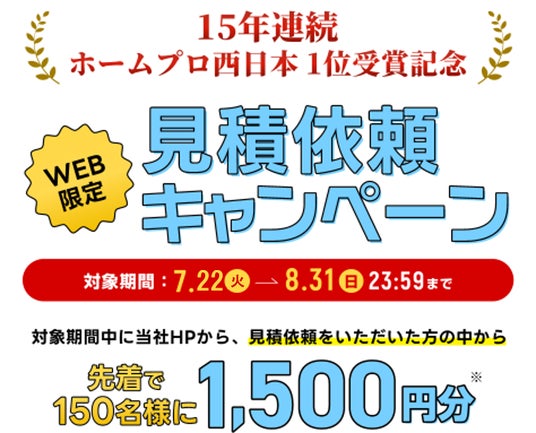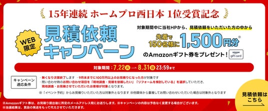 この結果、アートリフォームは15年連続でホームプロ西日本No.1(完了金額または件数のいずれか)を受賞。長年にわたるご支持への感謝の気持ちを込めて、Amazonギフト券がもらえるWEB限定キャンペーンを実施いたします。