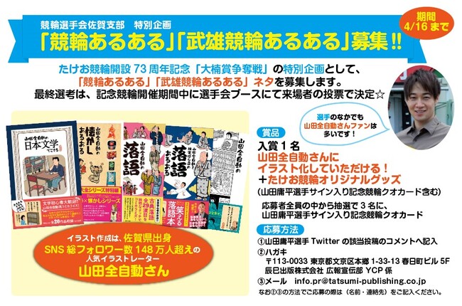 佐賀県・たけお競輪場開設73周年記念「大楠賞争奪戦」2023年4月22日(土)~2023年4月25日(火)のイベントとして選手会佐賀支部主催で「競輪あるある」「武雄競輪あるある」を募集。入賞作品は佐賀県出身の人気イラストレーター山田全自動さんがイラスト化!
