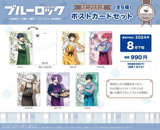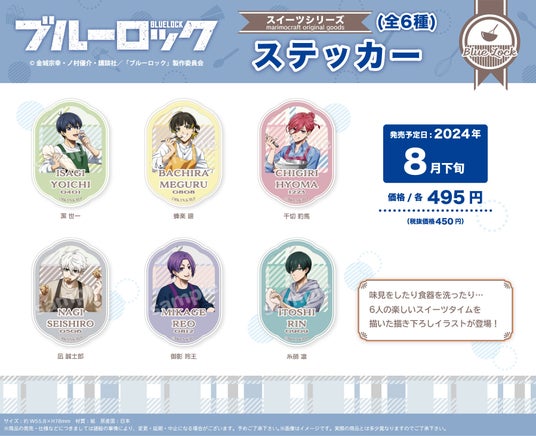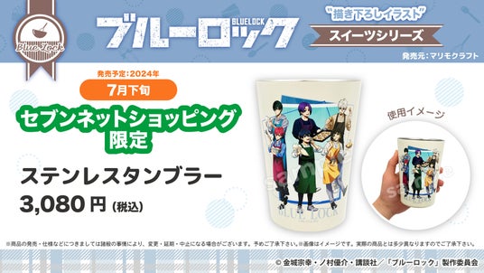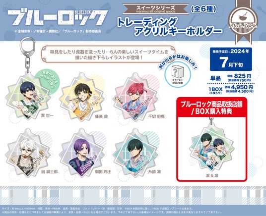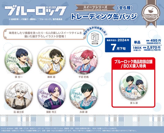 味見をしたり食器を洗ったり、楽しいスイーツタイムがテーマの描き下ろしイラストを使用したグッズが登場。潔 世一や蜂楽 廻をはじめとする6人のキャラクターの普段とは違う姿がたのしめるデザインが魅力です。セブンネットショッピング限定販売のステンレスタンブラーやアニメイト先行販売アイテムのアクリルスタンドやクリアファイルなど豊富なラインナップで展開します。何が出るかはお楽しみのトレーディング缶バッジ、トレーディングアクリルキーホルダーはBOX購入でうれしい特典がつきます。