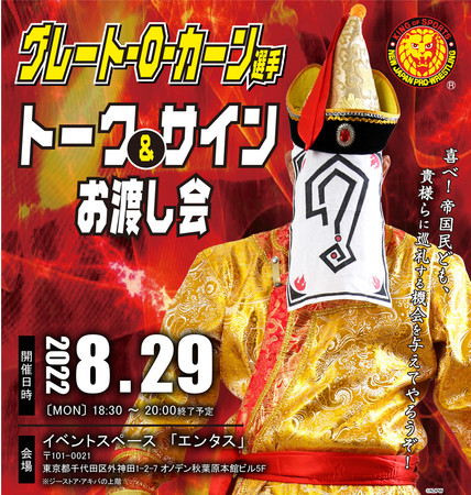 アニメやゲーム、マンガグッズのショップをはじめ、新日本プロレスグッズのショップ「闘魂SHOPサテライト」が並ぶキャラクター・ライフスタイル・ストア「ジーストア・アキバ」に、アキバ系の文化にも造詣が深いグレート-O-カーン選手をお招きし、<トーク&サインお渡し会>を開催いたします。