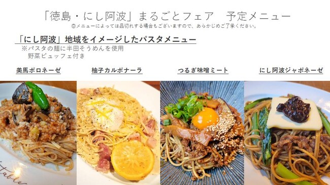 徳島県魅力体験型アンテナショップ「ターンテーブル」を会場に、12月5日から17日の間、「にし阿波」地域をイメージしたそうめんパスタメニュー、自然が育んだ鹿肉・猪肉を使用したイノシカハンバーグなど、厳しい自然環境との共存により育まれたにし阿波」の食材を使用したオリジナルメニューを提供します。