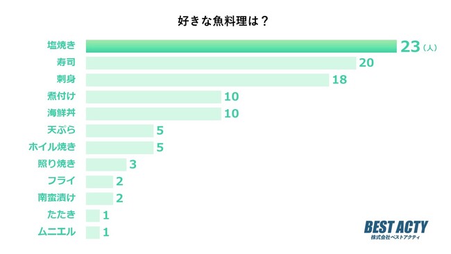 アウトドアメディア「TACKLE NOTE(https://tacklenote.com/columns/)」を運営する株式会社ベストアクティ(https://tacklenote.com)は、10代から60代までの100人に【好きな魚料理】についてアンケートを行いました。