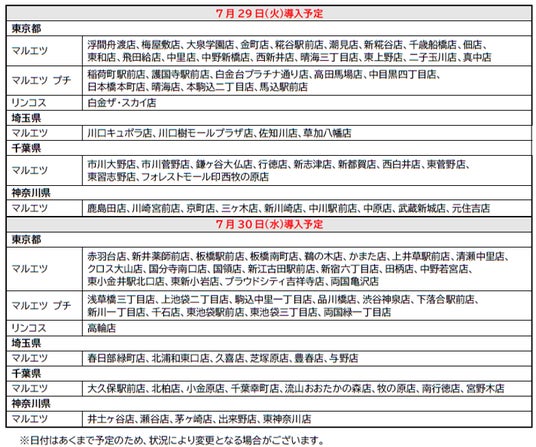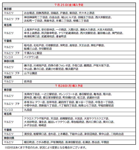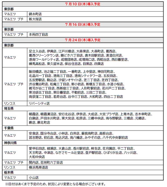 7月10日(木)から錦糸町店(東京都墨田区)、新大塚店(東京都豊島区)で導入いたします。さらに、7月16日(水)に本所四丁目店(東京都墨田区)で導入した後、7月24日(木)から7月30日(水)の間に順次、マルエツ・マルエツ プチ・リンコスの全店舗(魚悦糀谷店除く)で導入いたします。