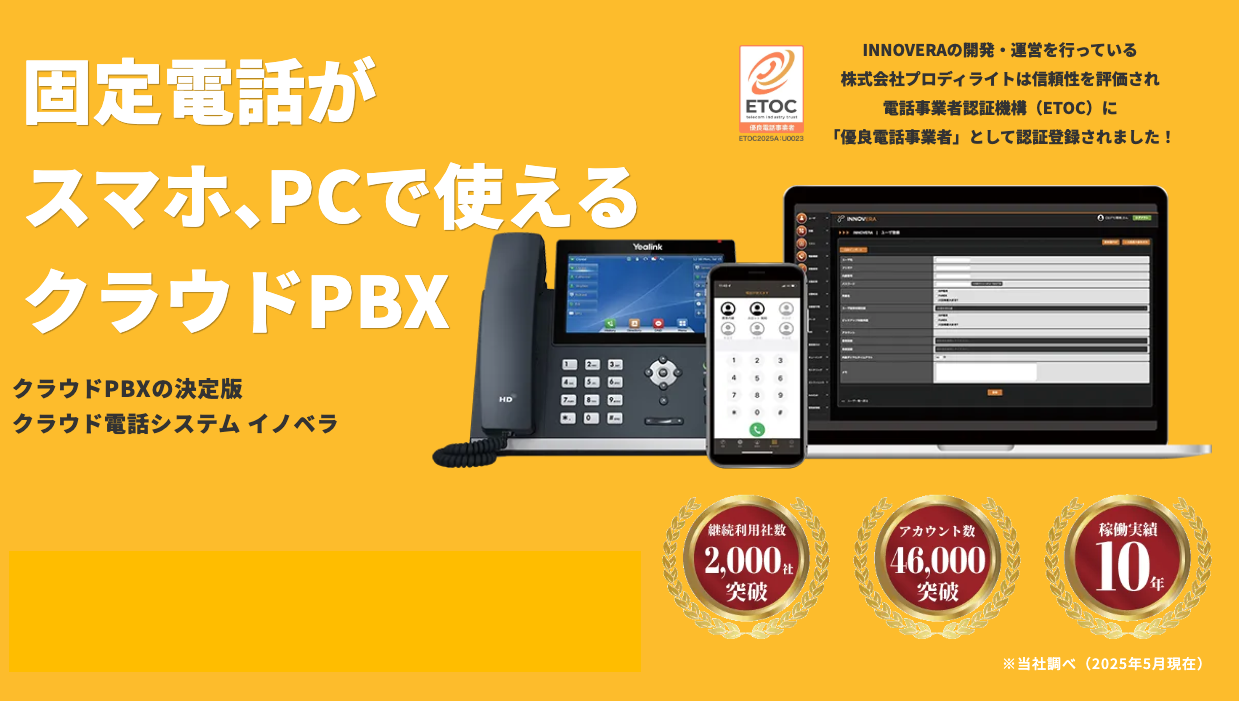 プロディライトは、「電話のDX」を推進するクラウドPBX「INNOVERA」(https://innovera.jp/)を提供しています。INNOVERAは、スマートフォンやPCにて会社の電話番号の発着信を可能にした現代の働き方に適した電話環境を提供する“Japan Quality”の国産クラウドPBXで、ビジネスフォン用途はもちろん、少人数のコールセンターの立ち上げ等、様々な用途に対応することもできます。