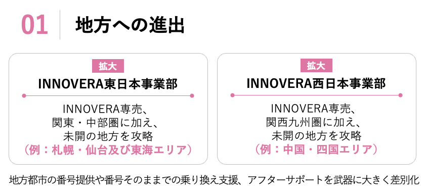 プロディライトは2025年8月期(18期)中間期の決算説明の際に、成長戦略として主力サービス「INNOVERA」の地方への進出を掲げております。上記の資料は前期のものとなりますが、こちらは今後も継続して行っていくプロディライトの重要な戦略となっております。
