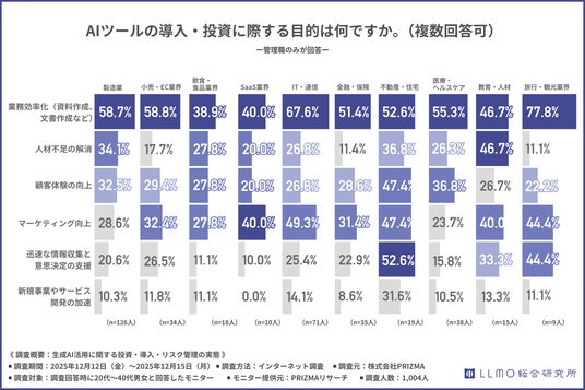 企業がAIツールに投資をする際、どのような効果や成果を目的としているのでしょうか。管理職の方に尋ねたところ、業界別で下記のような結果になりました。