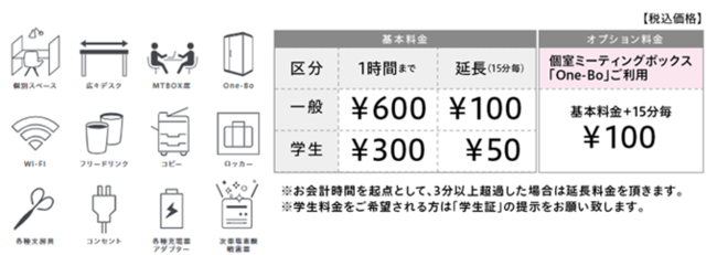 「MIRAIYA Bookmark Lounge」はテレワークやオンライン会議をはじめ様々な目的で利用できるラウンジスペースです。今回導入するOne-Boは、オンライン会議などの際、情報漏洩のリスクやまわりの騒音を気にすることなく、利用できる個室ブースです。個室ブースも兼ね備えた広島アルパーク店では、しきりのある1人席を24席完備。基本設備として、Wi-Fi完備のほか、フリードリンク、無料で貸し出しできる充電器や各種文房具等も取り揃えています。