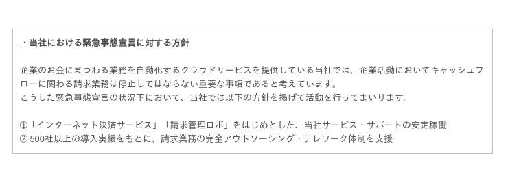 企業活動においてキャッシュフローに関わる決済業務、請求業務は止めることができない重要な事項であります。その中で、当社は企業のお金にまつわる業務を自動化するクラウドサービスを提供しており、社会的インフラとして絶対に止めることが許されないと考えます。