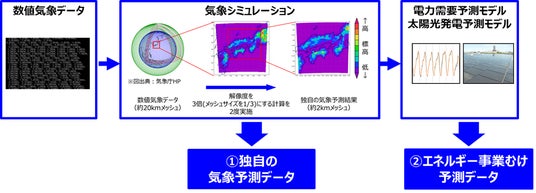 今回開発した予測技術は、気象庁の数値気象データ(コンピュータプログラムによる計算結果)から、領域を狭める代わりに解像度を高めた気象シミュレーションを独自に実施するもので、予測精度の向上を実現しています。さらに、エネルギー事業向け予測技術として、カレンダー情報や気象条件・過去の電力需要実績などから、電力需要を予測するモデルを開発したほか、太陽光パネルの設置条件と気象条件から太陽光発電の発電量を予測するモデルを開発しました。
