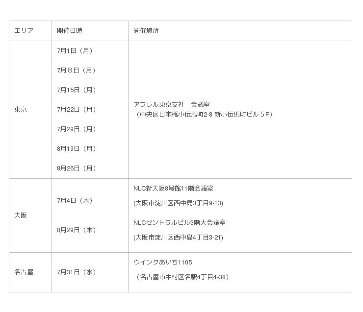 株式会社アフレル(所在地:福井県福井市、代表取締役社長:小林靖英、以降「アフレル」)は、こどもを対象にした新規事業をお考えの事業者様を対象に「こどもロボットプログラミング教室 事例・開設セミナー」を7、8月に開催します。この度好評につきまして東京・大阪・名古屋の3地区で開催いたします。本セミナーでは、プログラミング教育の現場に10年以上携わってきたアフレルの実績とノウハウをもとに、プログラミング教育市場の現状から具体的な教室開設プロセスまで充実した内容をお届けします。これまで、本セミナーには教育関連事業の方から異業種の方まで、幅広い業種の方々にご参加いただいております。2020年小学校プログラミング教育必修化を目前に控えた今、「自社ビジネス」に「プログラミング教育」をかけることで、自社事業の新たな価値創出にこの機会をご活用ください。(https://afrel.co.jp/afterschool/seminar)