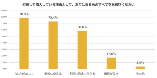 さらに継続して購入している理由についてより詳しく聞いたところ、「味が美味しい」「簡単に使える」と考える人が7割を超え、半数以上が「多彩な用途で使える」と答えたことから「だしパック」の価値が十分に浸透していると言えるでしょう。「価格が妥当」の回答は17.6%と少ないながらも、高価でも価値に納得した上で購入していると考えられます。