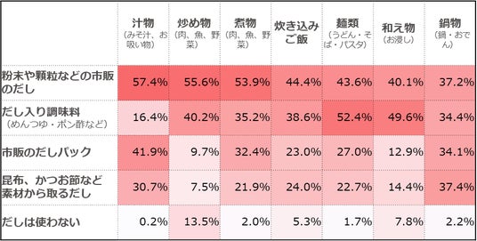 その一方で、全てのだし商品が「鍋物」では万遍なく使用されており、「だしパック」や「素材から取るだし」など時間や手間がかかる商品と、短時間で手軽に使えるものを使い分けていることが分かりました。
