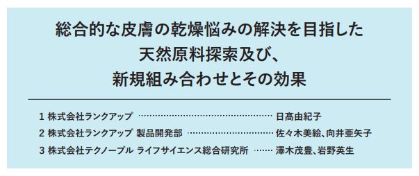 株式会社ランクアップ(本社:東京都中央区銀座 代表取締役:岩崎 裕美子)は、株式会社テクノーブル(本社:大阪府大阪市西区 代表取締役社長:澤木茂豊)と共同で3つの天然由来機能性成分の保湿メカニズムに対する効果について研究を行い、その成果を第22回日本抗加齢医学会総会(2022年6月17日(金)~6月19日(日))にて発表いたしました。