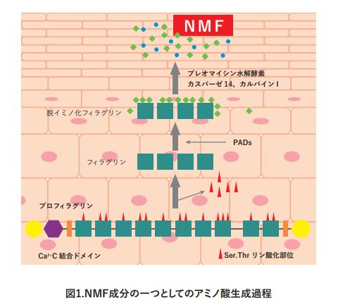 フィラグリンを構成するアミノ酸のアルギニンがシトルリンに変換(脱イミノ化)され、その後ブレオマイシン水解酵素 やカスパーゼ14などの分解酵素が働いてアミノ酸にまで分解される。