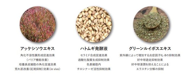 現在、アッケシソウエキス、ハトムギ発酵液、グリーンルイボスエキス、これら3つの天然由来機能性成分を応用した製品開発を行っており、生活者へお届けできるよう検討してまいります。