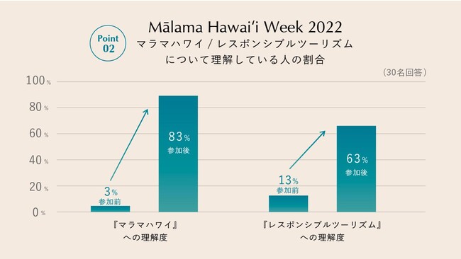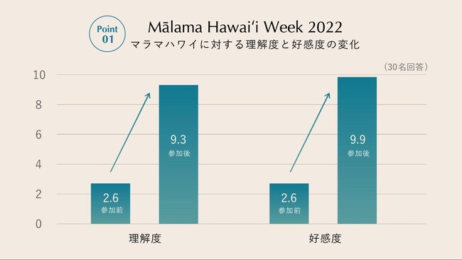 マラマハワイに対する理解度・好感度ともにツアー前後で大きく変容し、どちらも9ポイント以上の結果になりました。好感度に関しては9.9ポイントまで上昇し、ほとんど全ての参加者にとってマラマハワイの印象がポジティブに移りました。