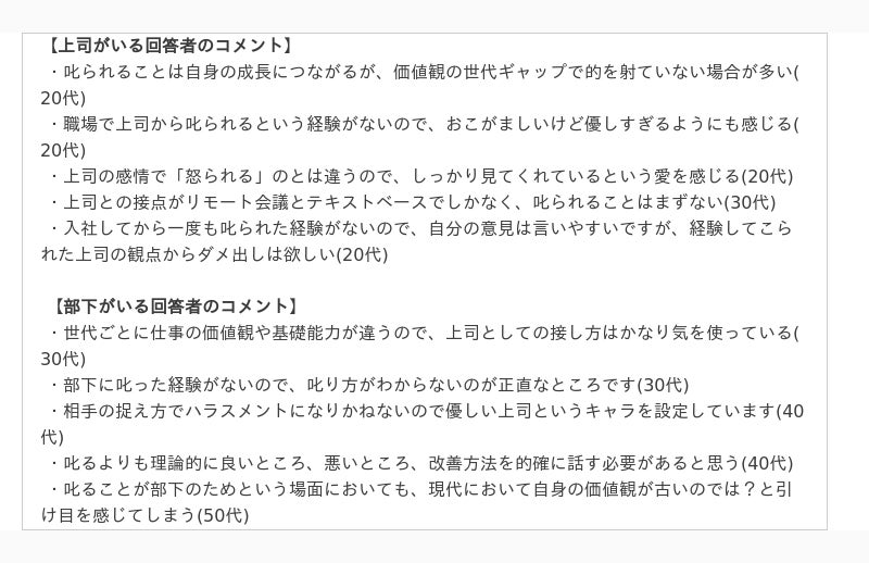 上司と部下によって叱る(叱られる)ことへの捉え方についてさまざまなコメントがありました