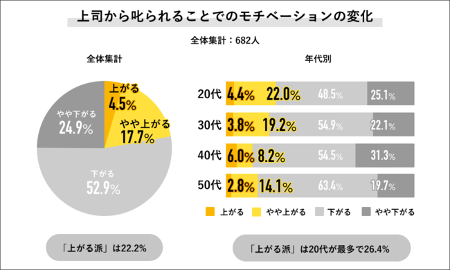 上司から叱られることで仕事に対するモチベーションの変化を聞くと、「上がる」4.5%、「やや上がる」17.7%を合算した22.2%が”上がる派”の回答をしました。”下がる派”の回答は77.8%で、内訳は「下がる」が52.9%で、「やや下がる」が24.9%でした。