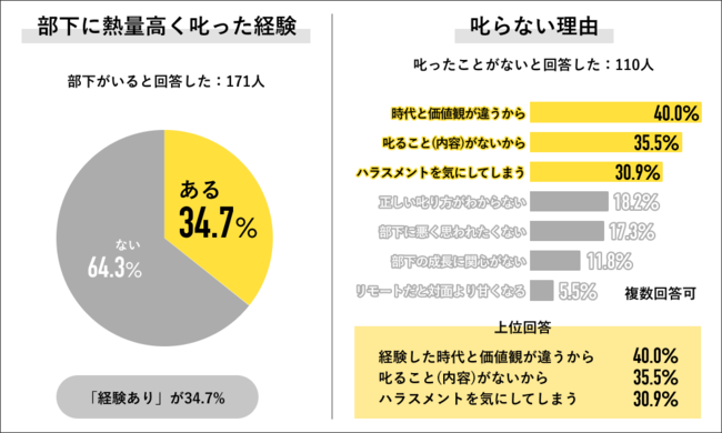 部下がいる171人に部下に熱量高く叱った経験の有無を聞くと、「経験あり」が34.7%で、「経験なし」が64.3%でした。叱らない理由についてみていくと、「時代と価値観が違うから」が40.0%で最多回答になり、次いで、「叱ること(内容)がないから」が35.5%、「ハラスメントを気にしてしまう」が30.9%で上位3つの回答結果になりました。
