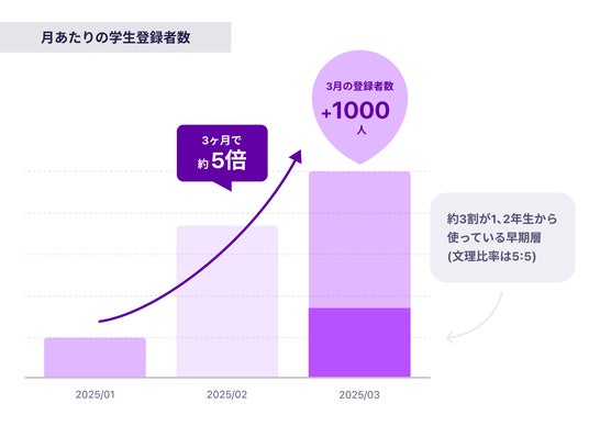 月あたりの学生登録数は3ヶ月で約5倍の1000名に