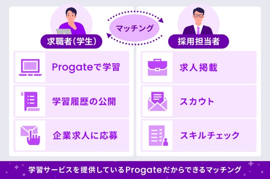 学習者側は、努力の成果(学習履歴や成果物・スキル)を公開することができ、学歴だけに左右されず自ら求人へ応募をしたり、技術力を評価してくれる企業からのスカウトを受けられる仕組みとなっています。