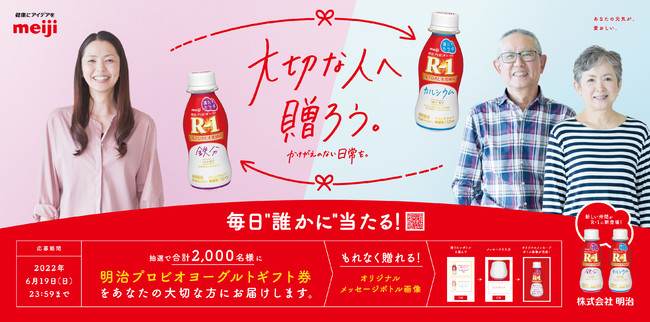 母の日から父の日までの期間に参加できる今回のキャンペーンでは、抽選で合計2,000名様に、明治プロピオヨーグルトギフト券(R-1 4個と引き換え可能)が当たり、贈りたい相手に届ける事ができます。