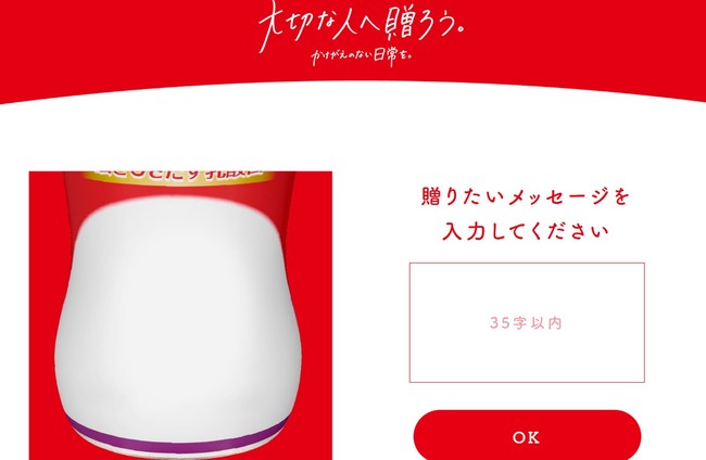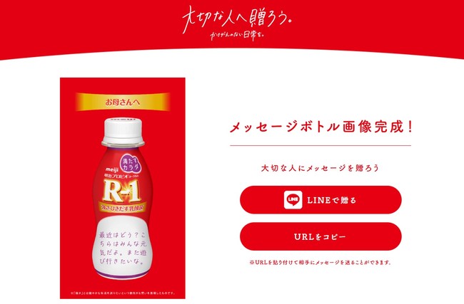 キャンペーンサイト上で、贈りたいボトルを選んで35文字以内でメッセージを入力すると、オリジナルメッセージボトル画像が出来上がり、SNSで簡単に贈ることができます。毎日の生活で不足しがちな栄養素をプラスした「明治プロビオヨーグルトR-1 満たすカラダ」オリジナルメッセージボトル画像に、あなたの大切な人に元気でいてほしいという想いを込めて、ぜひこの機会にメッセージを贈ってみてください。