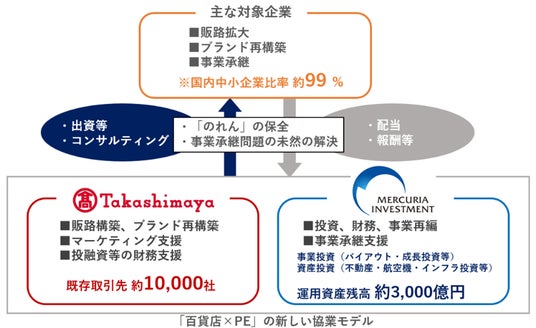 株式会社高島屋(代表取締役社長:村田 善郎、以下「高島屋」)と株式会社マーキュリアホールディングスの子会社である株式会社マーキュリアインベストメント(代表取締役:豊島 俊弘)及び株式会社マーキュリアアドバイザリー(代表取締役:深井 聡明、2社総称して以下「マーキュリア」)は、両社協業のもと、国内中小企業が有する伝統・技術を守り、文化・歴史を未来につなぐ「百年のれんプロジェクト」を発足いたしましたので、下記のとおりお知らせいたします。