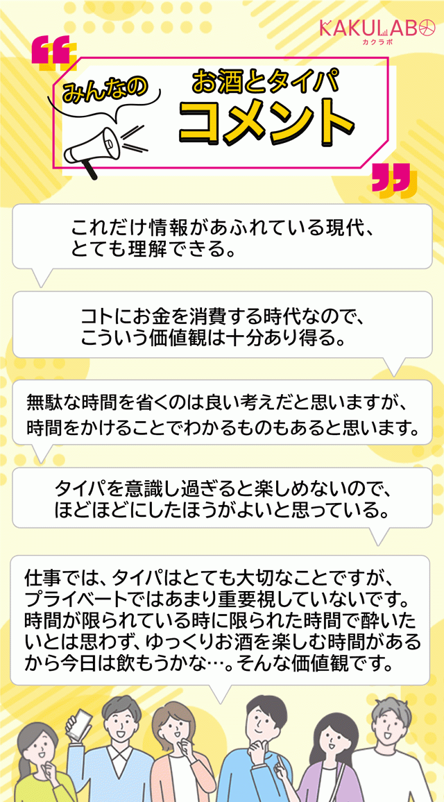 特に、「飲酒時間にタイパは求めない」という確固たる意見は多く見受けられました。