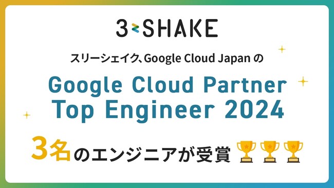 株式会社スリーシェイク(本社:東京都新宿区、代表取締役社長:吉田 拓真、以下スリーシェイク)は、この度 Google Cloud Japan の「Google Cloud Partner Top Engineer 2024」において、スリーシェイクから3名のエンジニアが受賞したことをお知らせいたします。
