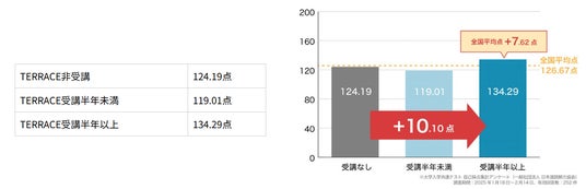 TERRACE(速読解力講座)を半年以上受講した生徒の平均点は、非受講生と比較して10点以上高い結果となりました。これは、全国平均点(126.67点)と比較しても+7.62点という結果で、長文読解や複数の情報を統合する問題において、トレーニングによって培われた情報処理能力と読解スピードが大きく影響したと考えられます。