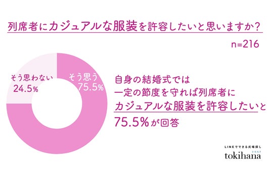 LINEでできる式場探し『トキハナ( https://tokihana.net/ )』を運営する株式会社トキハナ(本社:東京都港区、代表取締役社長:安藤 正樹、以下 「トキハナ」)は、インターネットリサーチにより、結婚式を実施した20~30代の男女216人を対象に調査を行ったところ、主催者の75.5%が「節度を守れば参列者はカジュアルな服装でも問題ない」と考えていることが分かり、服装の自由度を受け入れる意識が高まりつつある一方で、参列時の服装について「誰かから指摘を受けたことがある」と回答した人は50.5%にのぼりました。