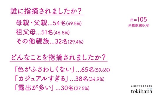 服装に関する指摘内容として最も多かったのは、「色がふさわしくない」という声でした。白に近い色や派手なカラーを避けるといった、いわゆる“暗黙のマナー”がいまだに根強く意識されていることがうかがえます。