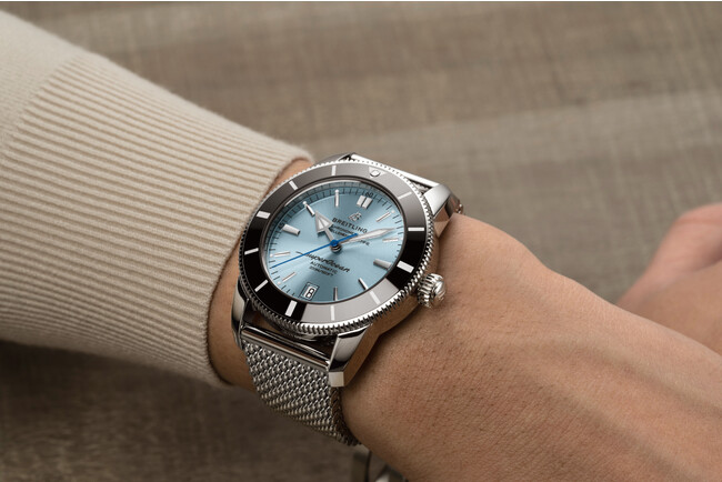 この度発表された日本限定モデルは、機能性とスタイルを併せ持った特別なスーパーオーシャン ヘリテージです。文字盤に控えめに輝くアイスブルーを採用し、水色のセンター秒針を組み合わせることで、さりげない特別感を演出しています。一方、ケースバックにはONE OF 200の刻印が施され、このモデルが紛れもない希少なモデルであることを証明しています。200m防水のケースに、モダンレトロなメッシュブレスレットまたはそのデザインを模したラバーストラップの組み合わせが選択可能です。スーパーオーシャン ヘリテージ B20 オートマチック 42 ジャパン リミテッドは、伝説的な歴史、機能性、さらに唯一無二の美しさまで兼ね備えたタイムピースです。