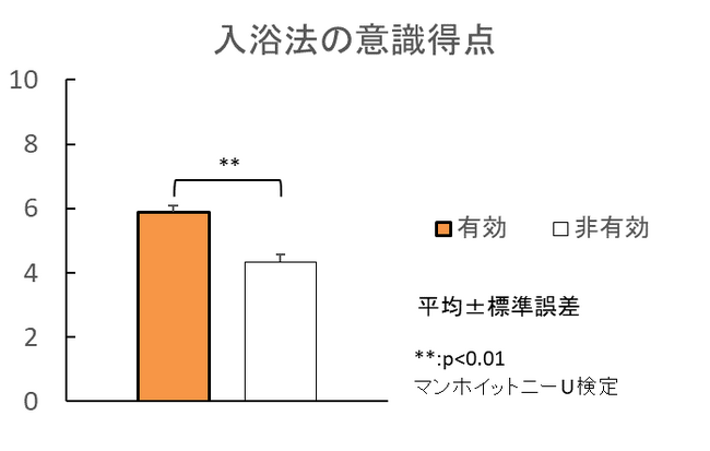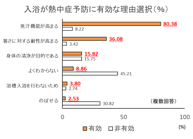 ◆「有効」または「やや有効」と回答した人は、「発汗機能が高まる」、「暑さに対する耐性が高まる」という理由を選択する割合が多く、入浴時の入浴法の意識得点も有意に高くなりました。