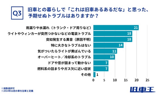最も多かったトラブルは「雨漏り・水漏れ」で、続いて「電装系のトラブル」「異音」が同率で2位という結果に。