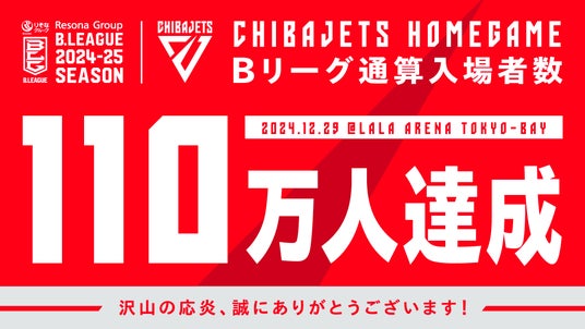 千葉ジェッツでは2024年12月29日(日)vs.島根スサノオマジック戦にて、B1リーグ戦(レギュラーシーズンのみ)通算入場者数110万人を突破したことをお知らせいたします。こちらはBリーグ最速での記録達成となります。