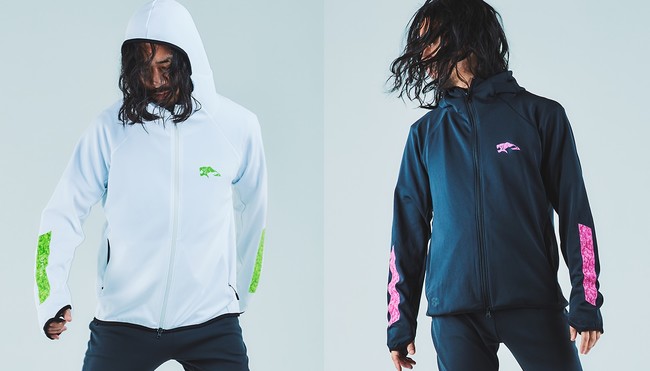 吸水性のあるフーディーに、虎と兎を用いたカモフラ柄を袖に、虎と兎をイメージしたロゴマークを胸に再帰反射でプリントしました。それぞれのヒーローマークをかたどったファスナーの引き手も特徴。袖口は手の甲の日焼け対策にもなるサムホール仕様です。