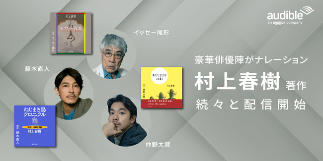 世界最大級のオーディオブック及び音声コンテンツ制作・配信サービスであるAmazonオーディブル(以下、オーディブル)は、村上春樹さん著の『神の子どもたちはみな踊る』を仲野太賀さん、『東京奇譚集』をイッセー尾形さん、『ねじまき鳥クロニクル―第3部 鳥刺し男編―』を藤木直人さんの朗読で、7月15日(金)より配信することをお知らせします。